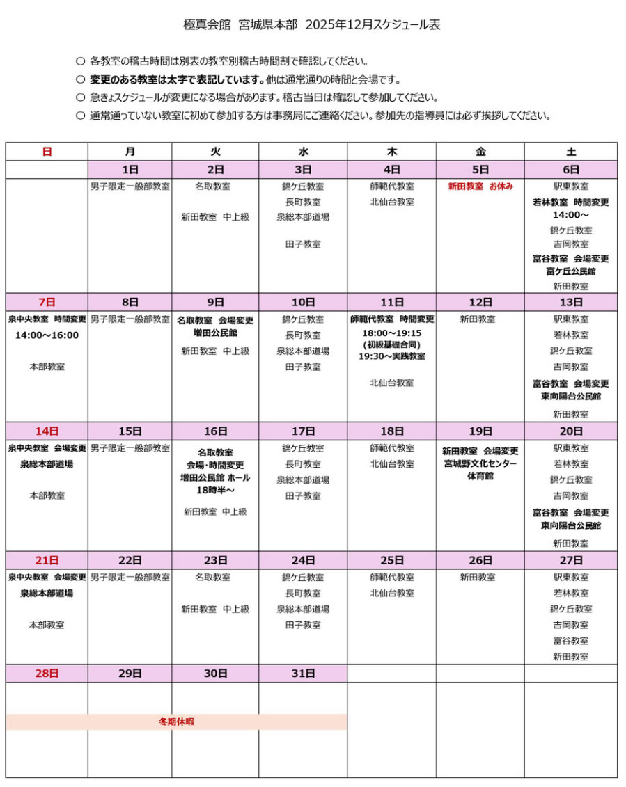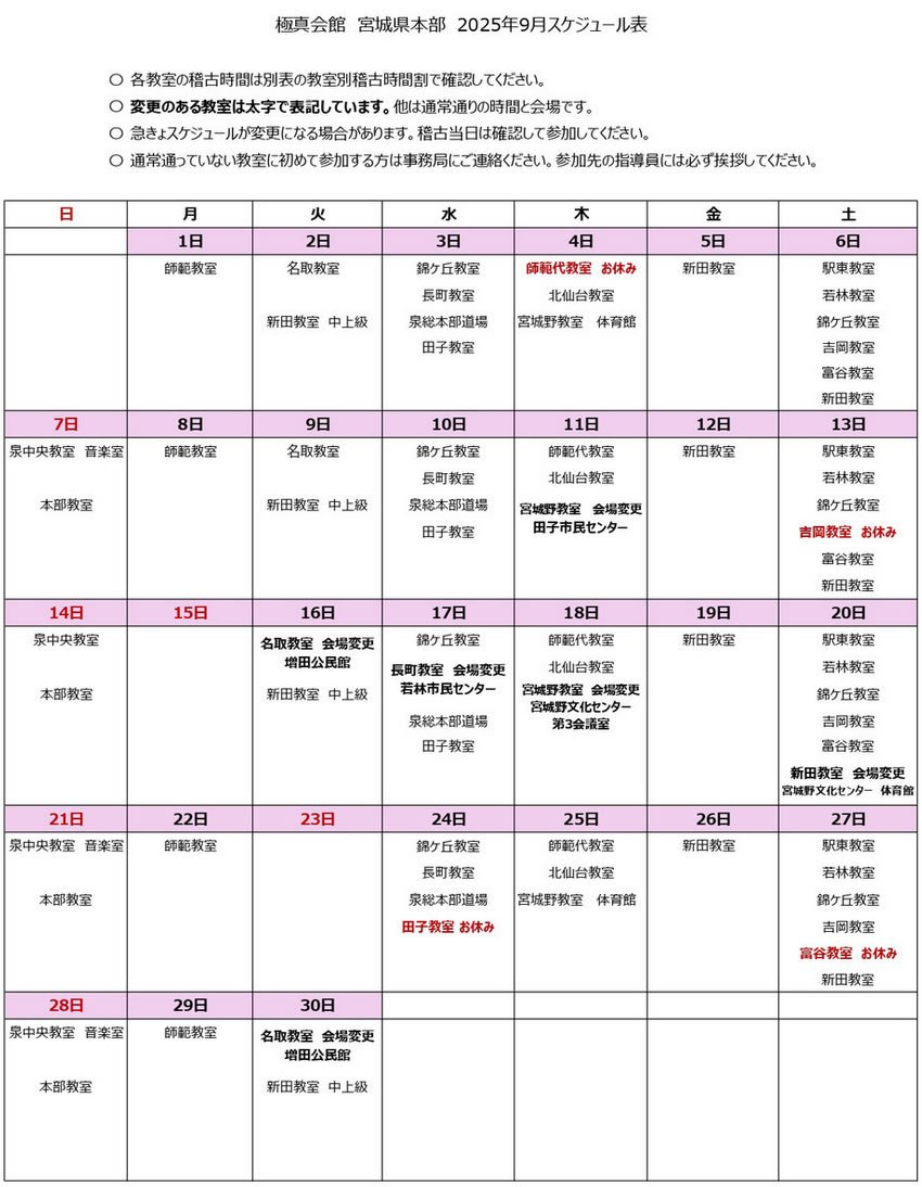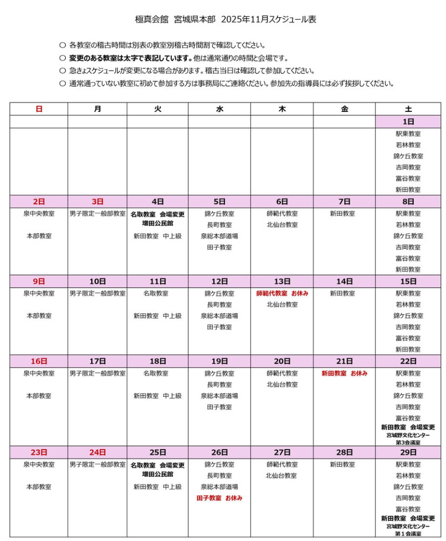 ○24日の駅東教室は会場が「若林市民センター」に変更となります。若林教室との合同稽古となり、駅東教室の指導員が担当いたします。